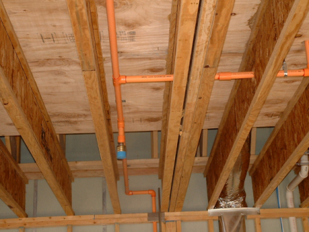 Certain portions of the fire system (i.e. water piping) are more easily and cost-effectively installed in the earliest stages of the construction, while the actual finish (i.e. installing the fire devices, testing the system, etc.) will take place after the house is framed. Fire sprinkler systems are often completed prior to the other systems in your home, but other mechanical trades may work alongside us if necessary.